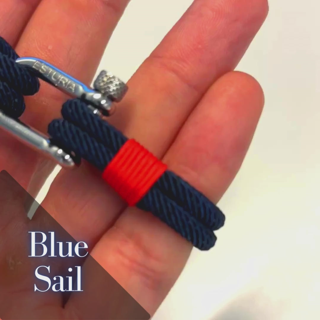 Es la perfecta combinación de estilo y sofisticación. Fabricada con cuerda marina azul y hebilla plateada es finalizada con un toque rojo que plantea un contraste perfecto.
